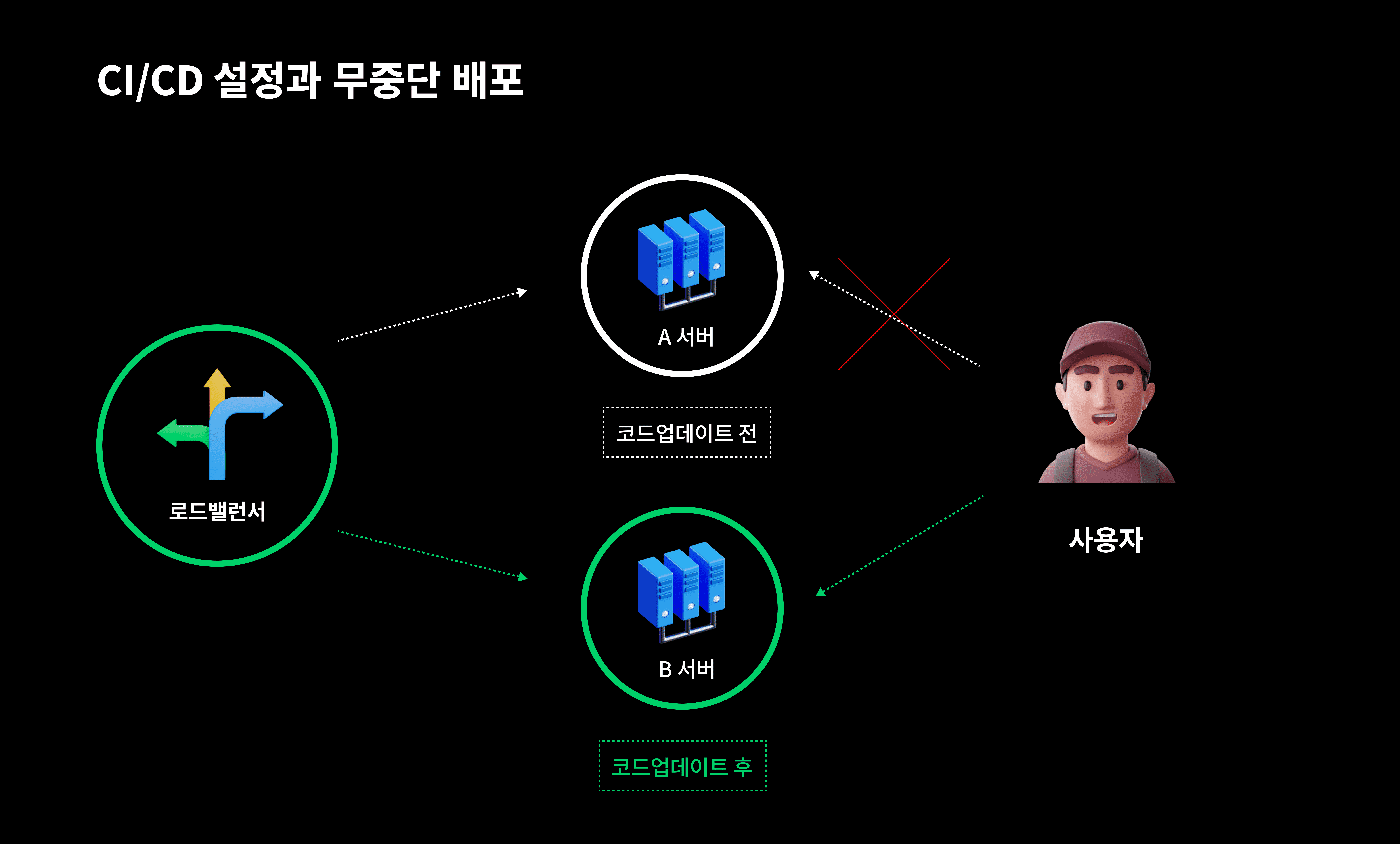 CI/CD 설정을 통해 개발자가 업데이트한 코드를 일일이 서버에 수동으로 배포하지 않아도 되며, 무중단배포 설정을 통해 유저들이 365일 24시간 내내 중단, 끊김없는 서비스 이용이 가능합니다.