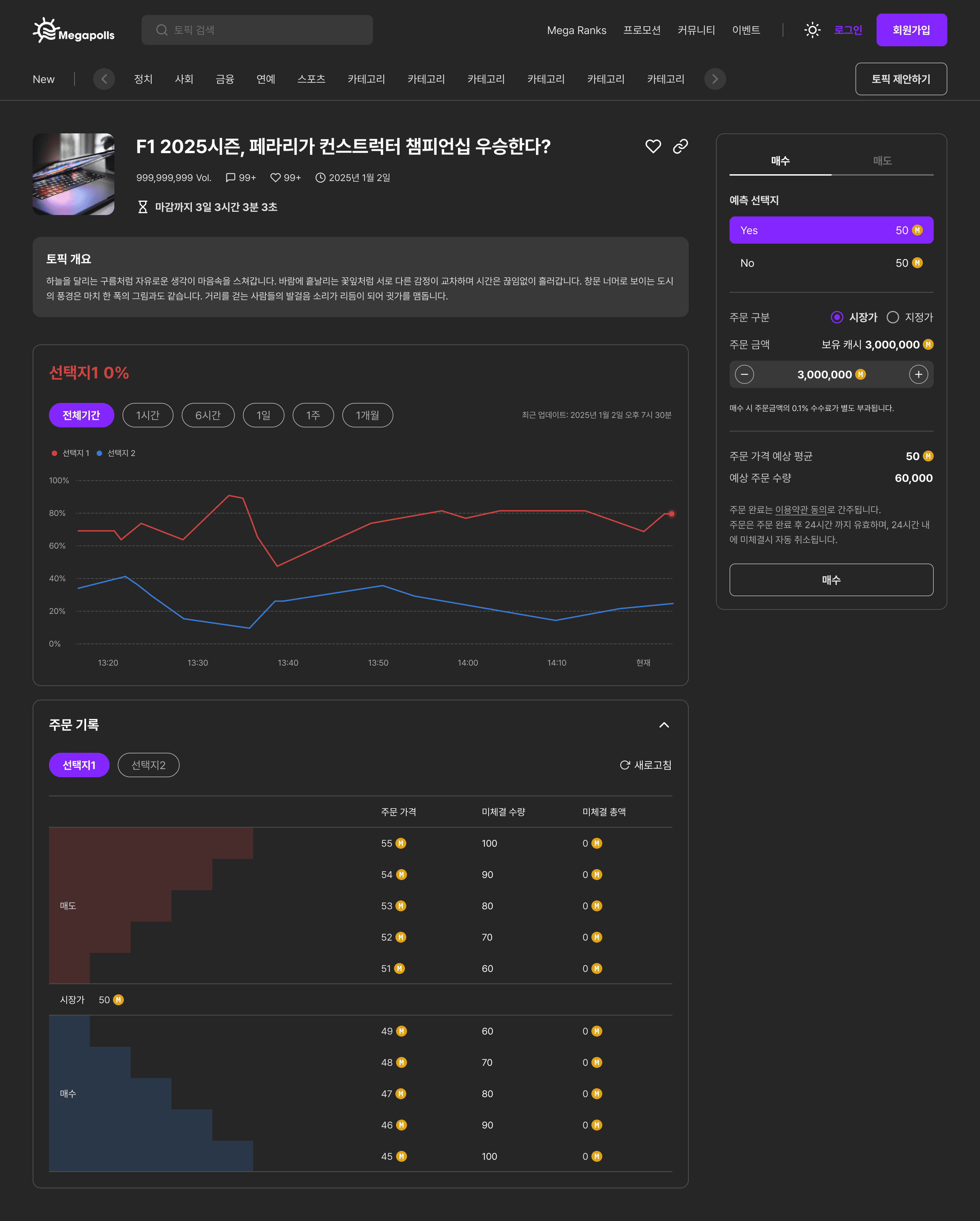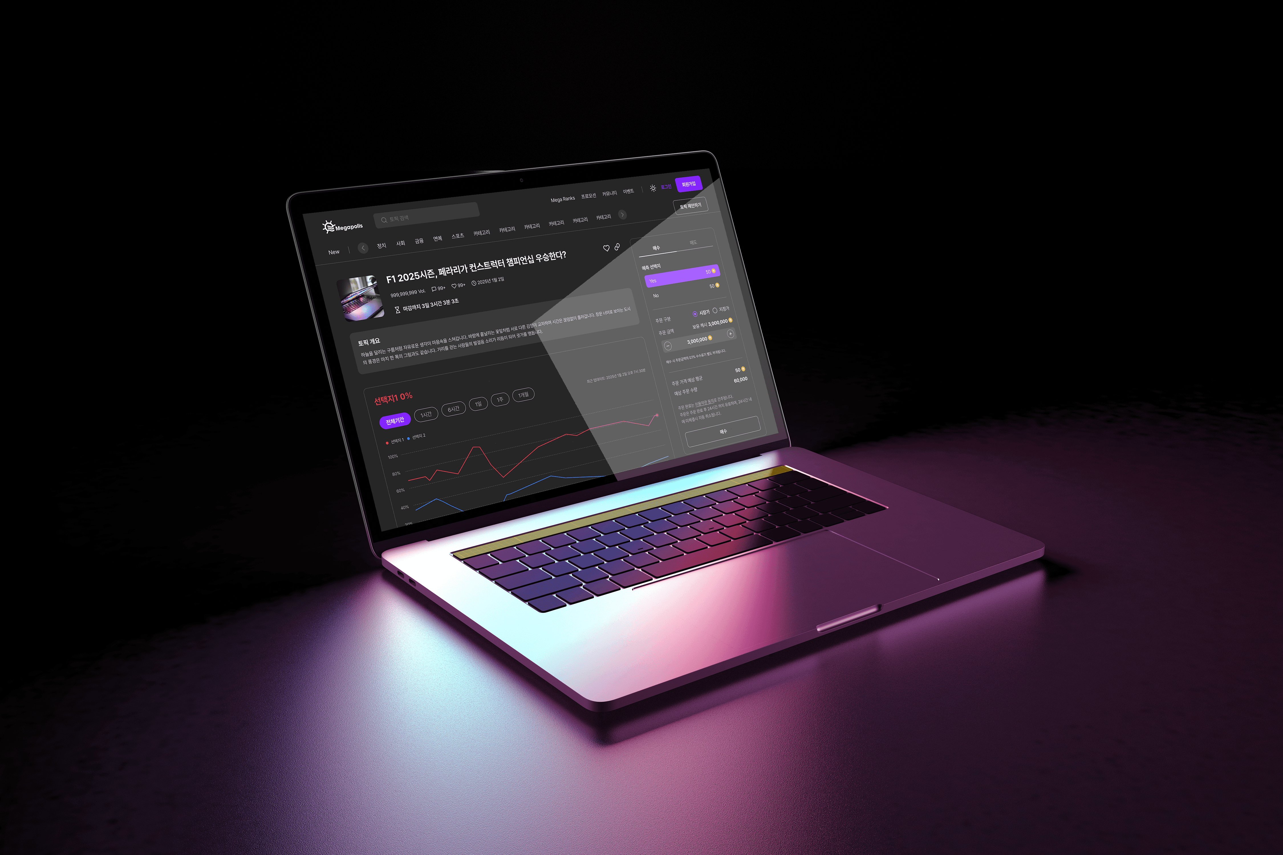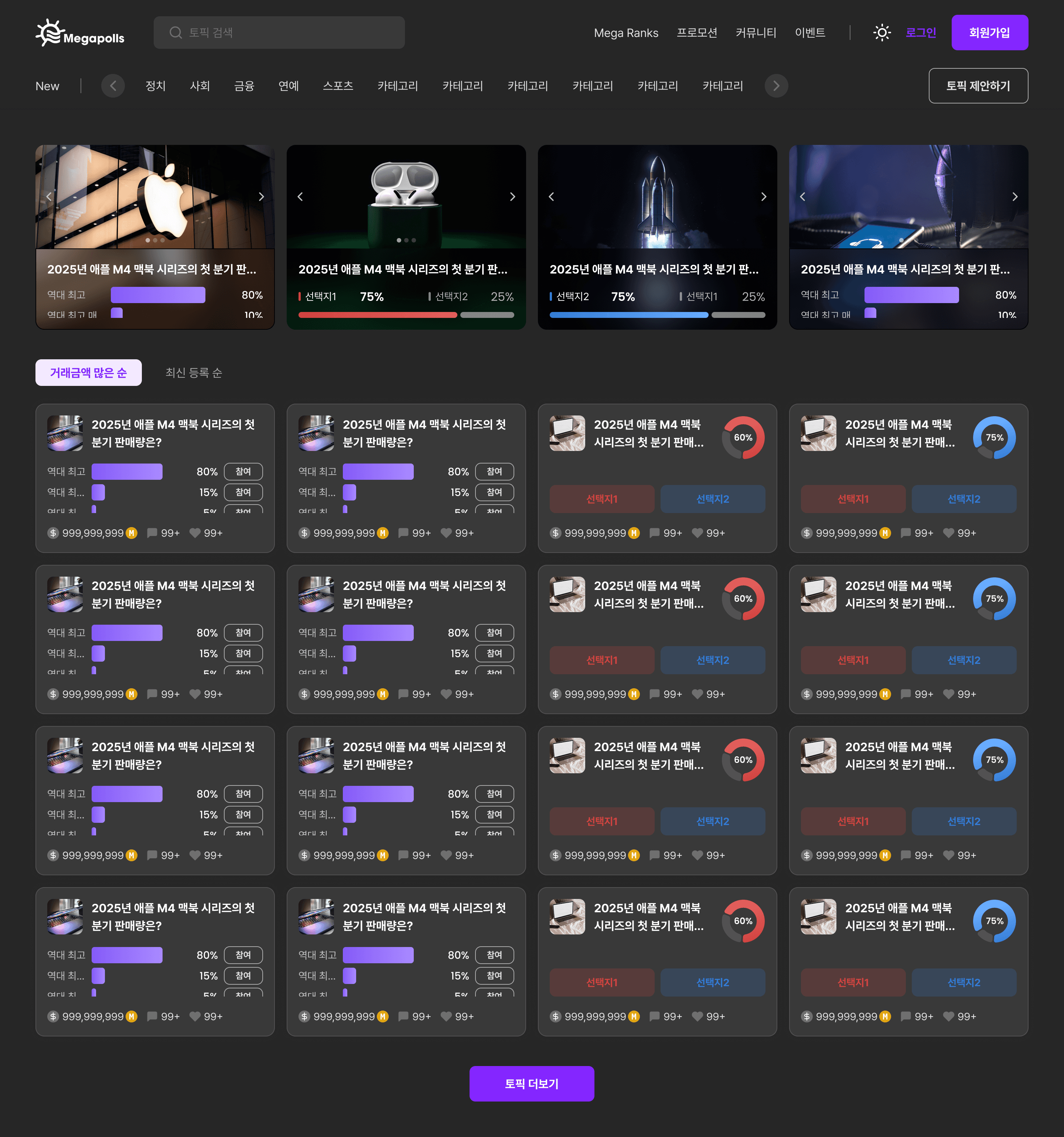 Megapolls는 단순 설문조사를 넘어 가상 자산 기반의 게이미피케이션 요소를 결합한 투표 플랫폼입니다. 사용자가 토픽에 대한 의견을 표현하면서 동시에 예측 게임에 참여하는 경험을 제공하는 것이 핵심 목표였습니다.