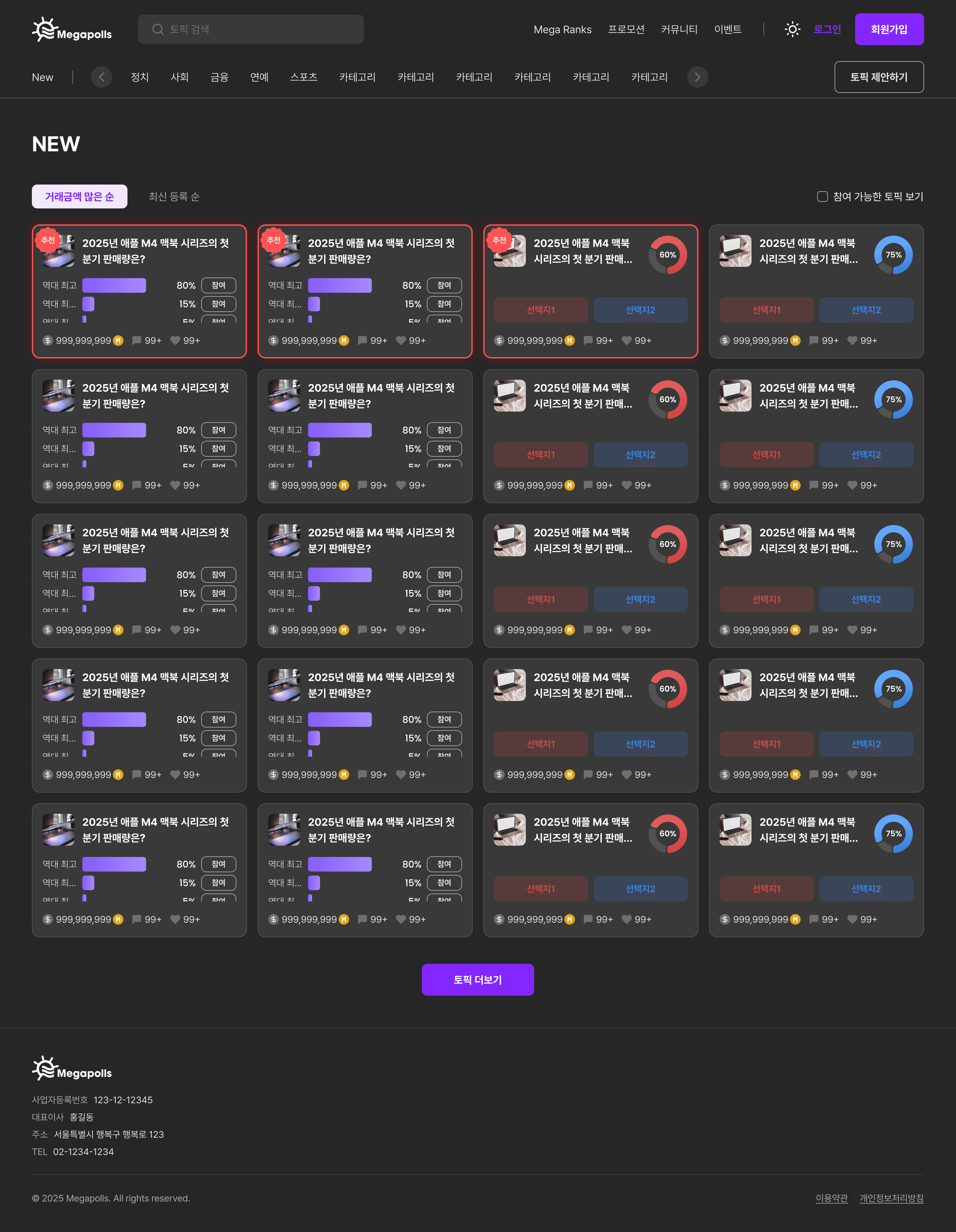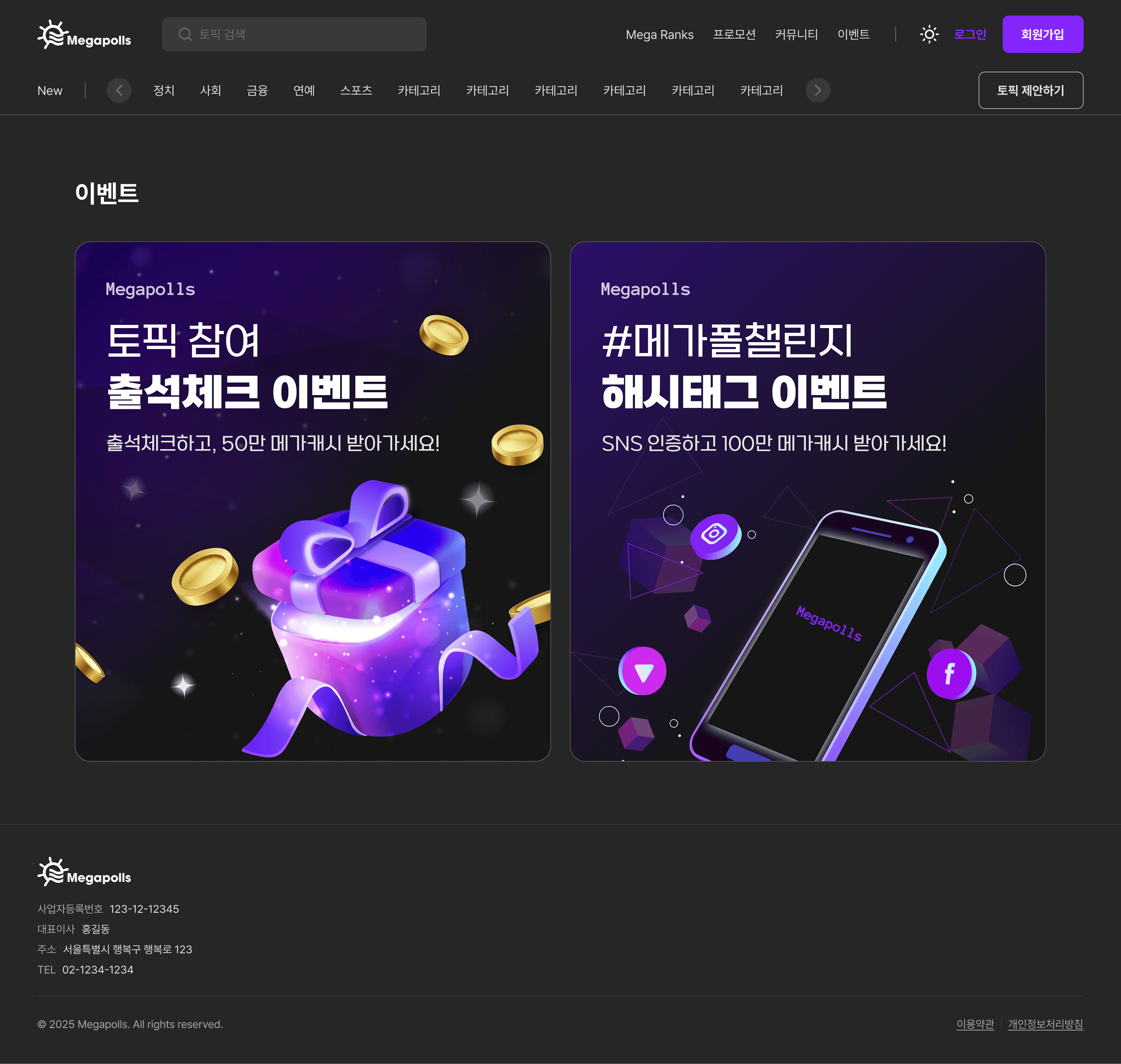 Megapolls는 토픽 기반의 실시간 투표 및 여론조사 플랫폼입니다. 사용자는 다양한 토픽에 대해 양자택일 또는 다지선다 형태로 투표에 참여하고, 실시간으로 집계되는 결과를 확인할 수 있습니다. 가상 자산(캐시) 시스템을 통해 투표에 참여하며, 출석체크 이벤트 등 다양한 프로모션 기능을 제공합니다.